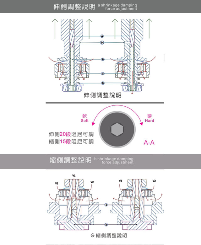 伸側20段阻尼可調,藉由A-A圖鈕動旋鈕使A部向上或向下改變閥口大小,閥口越小阻尼力越大,反之則越小。改變閥口的大小達到阻尼力强弱的設立。