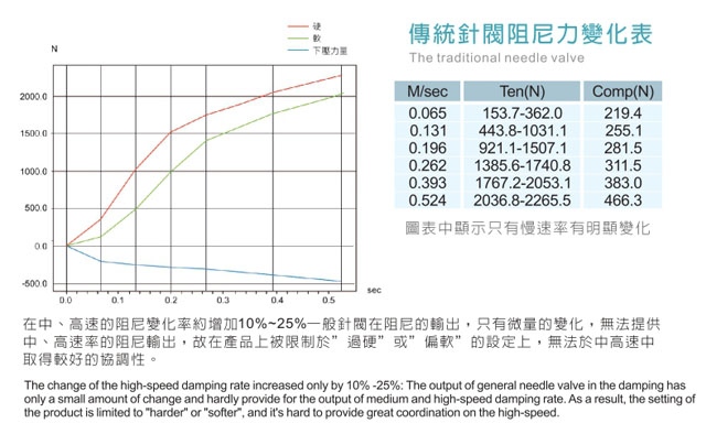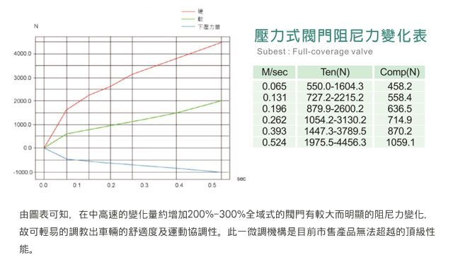 車輛於山道高速運動的同時,需要精準的阻尼力輸出,法爾斯能提供最優秀的耐衝擊材料,力求耐久性、低磨耗,並採用"反向彈黃"設計,提供車輛於高速灣道時抑制側傾的能力。 當車輛於彎道中期,因阻尼力無法抑止側傾的同時,反向彈簧即時減緩活塞位移的速度,使車輛於彎道中可以抑止側傾的速度,並目力保不因阻尼力的不封稱輸出,而有輪胎離開地面的狀況發生。